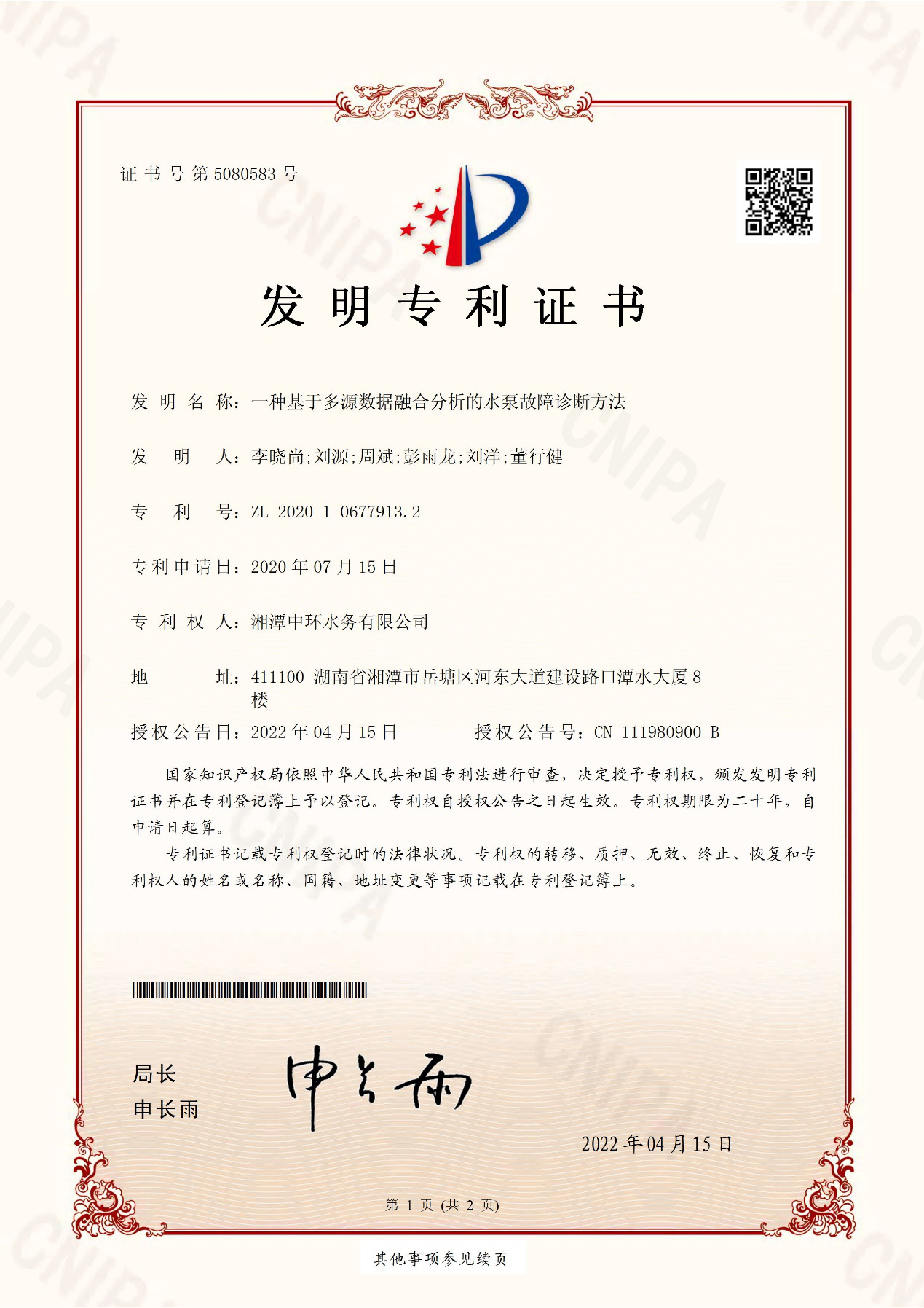近日,依托中環水務牽頭承擔的2020年度集團公司重大科技創新項目《智能水廠整體工藝方案》與《生態型村鎮污水處理技術工藝包》的技術成果,“一種基于多源數據融合分析的水泵故障診斷方法”和 “一種蠕蟲床化糞池”兩項發明專利獲得國家知識產權局授權。