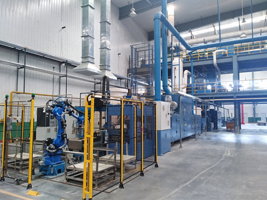 ▲機械手收板(駱駝新疆蓄電池) 該項目是集團公司聚焦“雙碳”目標與產業(yè)升級需求啟動的重點攻關項目,是為鉛酸蓄電池生產企業(yè)提供綠色節(jié)能生產車間的設計及關鍵核心裝備制造。項目團隊通過工藝流程再造,構建起“綠色工藝+智能裝備+數(shù)字管控”的全鏈條創(chuàng)新體系,從源頭減少鉛消耗和三廢排放,減少工人數(shù)量,提高了單位面積產出比,提高了生產效率,系統(tǒng)性破解了傳統(tǒng)鉛蓄電池生產中鉛耗高、污染重、效率低的行業(yè)痛點,最終實現(xiàn)鉛酸蓄電池的綠色生產。 目前,該項目研發(fā)的工藝技術和設備已在駱駝股份、風帆股份、超威集團、天能股份、理士國際等知名鉛酸蓄電池生產企業(yè)成功應用,使企業(yè)的生產效率大幅提升,人工成本、生產能耗和物耗大幅降低,鉛、酸污染物排放指標優(yōu)于國家標準,資源和能源消耗指標、污染物控制指標均優(yōu)于國家清潔生產一級基準值,經(jīng)濟效益、環(huán)境效益和社會效益顯著。