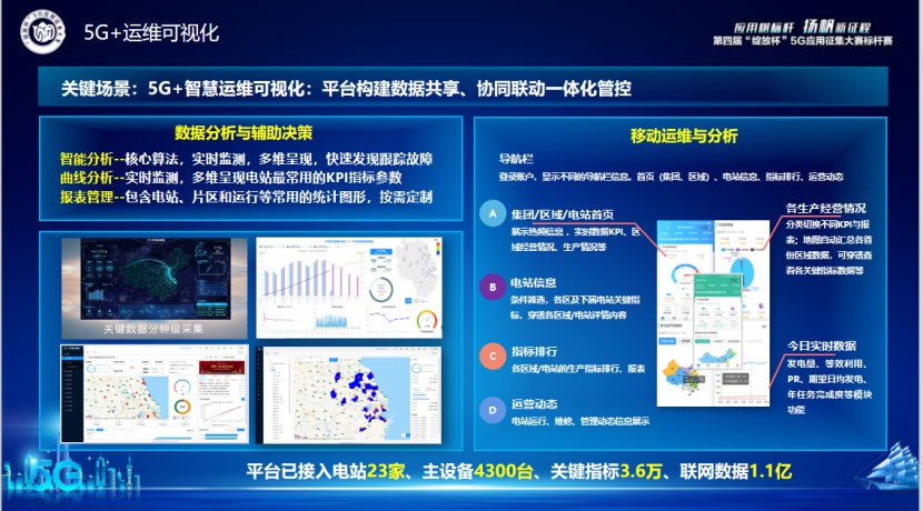 光伏智造智維協同創新云平臺是鎮江公司圍繞“數字化太陽能”的戰略目標,自主研發的光伏工廠智能制造與電站智能運維的協同創新應用。通過4大類(智慧園區、智能生產、智能運維以及統一標識)、20個場景的研究,重點解決3A(AI\AGV\AR)融合創新與數字賦能。截至2021年11月,云平臺應用榮獲兩化融合AAA評定、工業互聯網標桿工廠、五星上云、四星安全、第三屆綻放杯全國優秀獎、SNEC吉瓦級金獎等24項榮譽、8項軟著;平臺已接入31個5G基站、150個5G終端,主設備4700臺;每年標識量5300萬;關鍵采集指標5.8萬、聯網數據2.3億;產能提升50.7%、運維效率提升80%;為大數據分析提供支撐并形成數據資產,實現對內/對外數字化應用服務與轉型輸出。