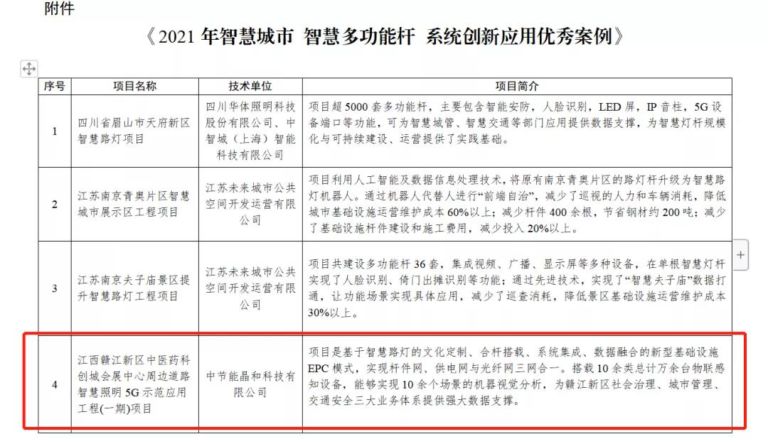 12月8日,國家節能中心官網發布《2021年智慧城市 智慧多功能桿 系統創新應用優秀案例》,江西公司下屬子公司中節能晶和科技有限公司“江西省贛江新區中醫藥科創城會展中心周邊道路智慧照明5G示范應用工程(一期)項目”,經國家節能中心專家評價篩選,結合實地考察結果,專家組終審確認成功入選。此次國家節能中心經過現場核實、情況復查、信譽核查及公示等環節僅評選出10個符合標準的優秀案例。